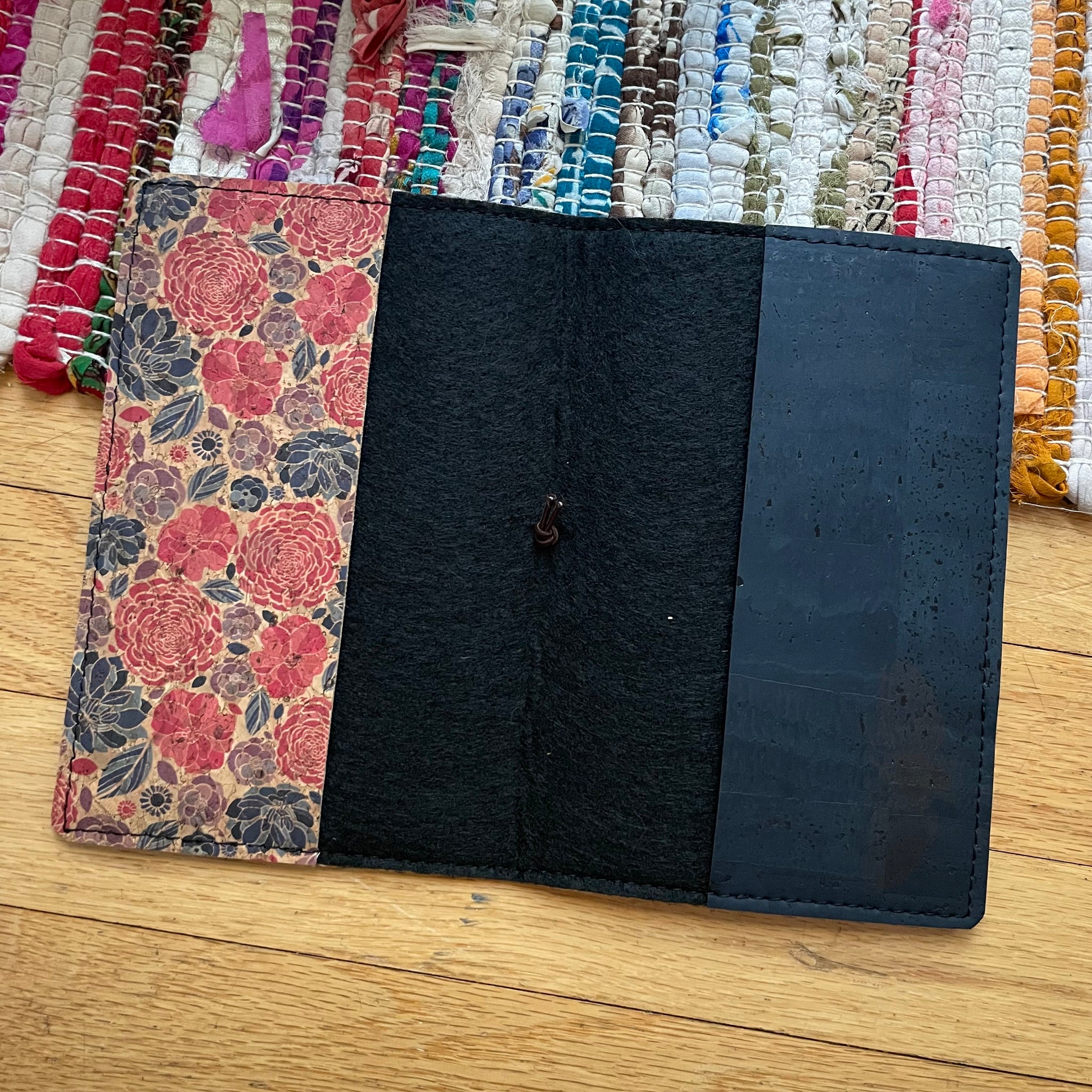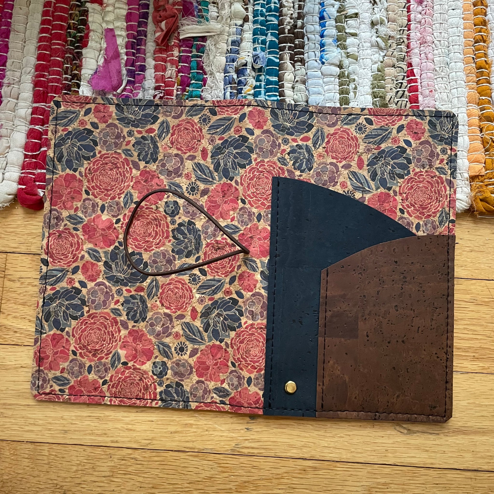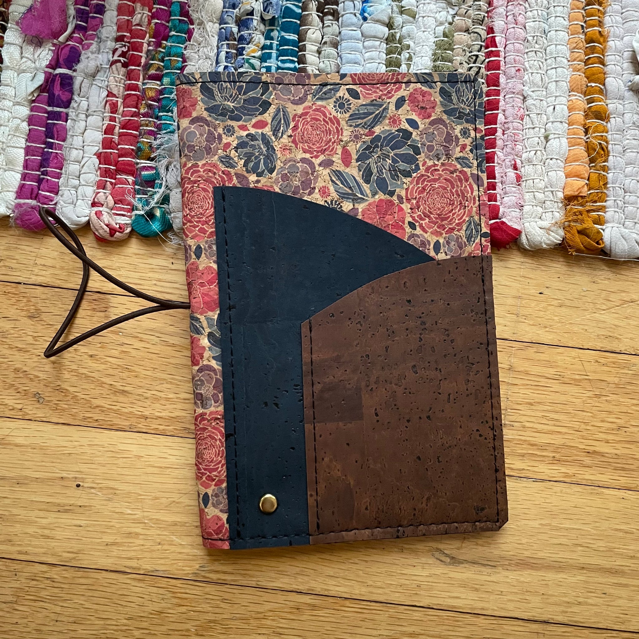This is a Carnation Breeze (pattern) cork cover with Midnight (deep blue) and Branch (deep brown) swoop Multi-pocket. It has black felt and one pattern and one midnight inside pocket. This cover is finished with a brown elastic closure and a brass accent. This cover is a folio style with inside pockets to slip your notebook inside.