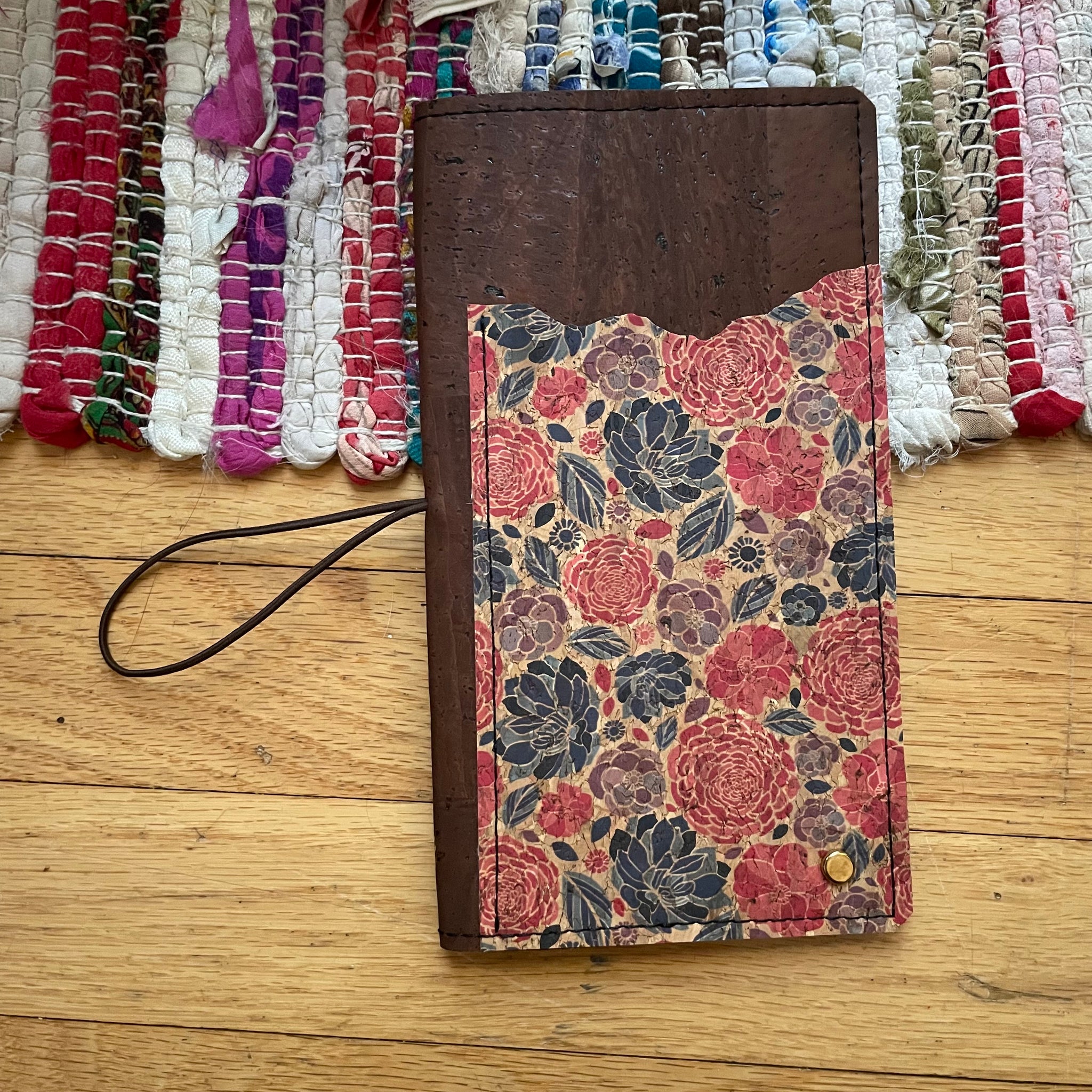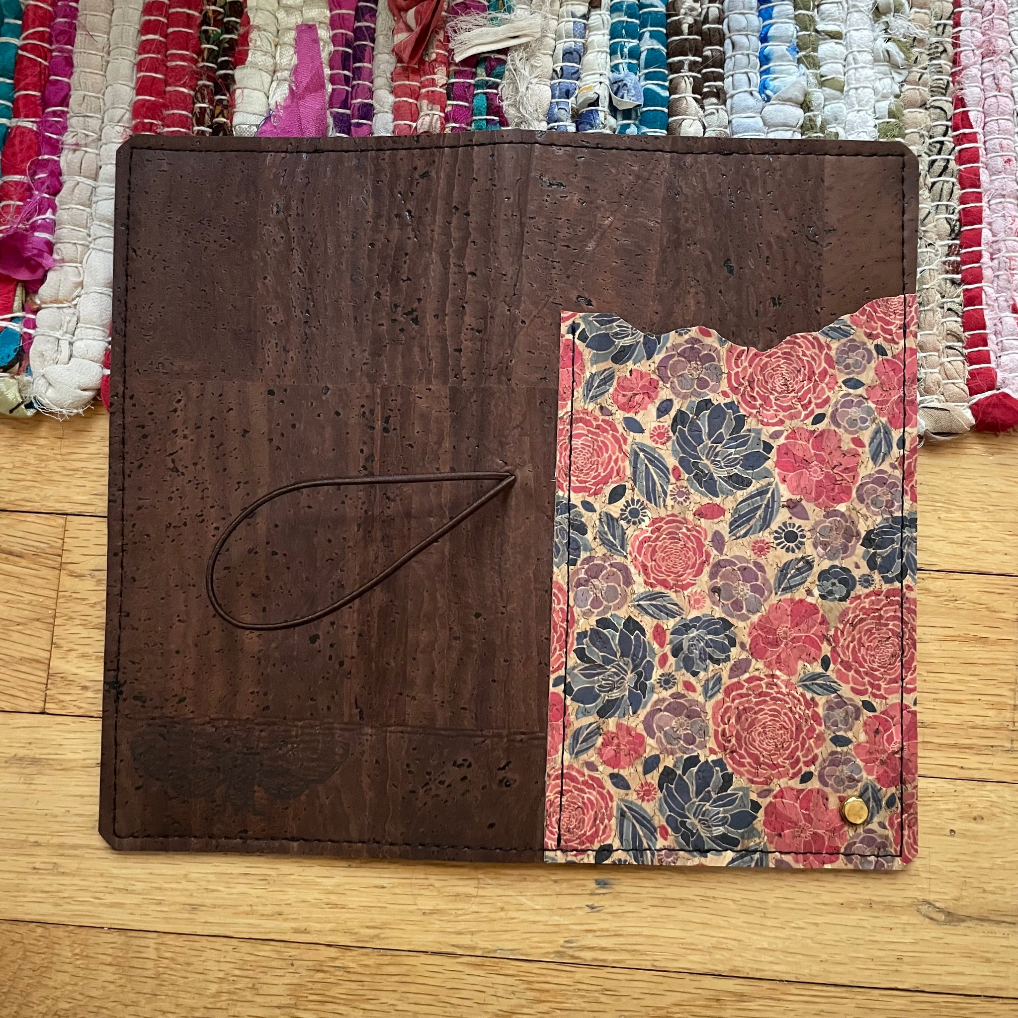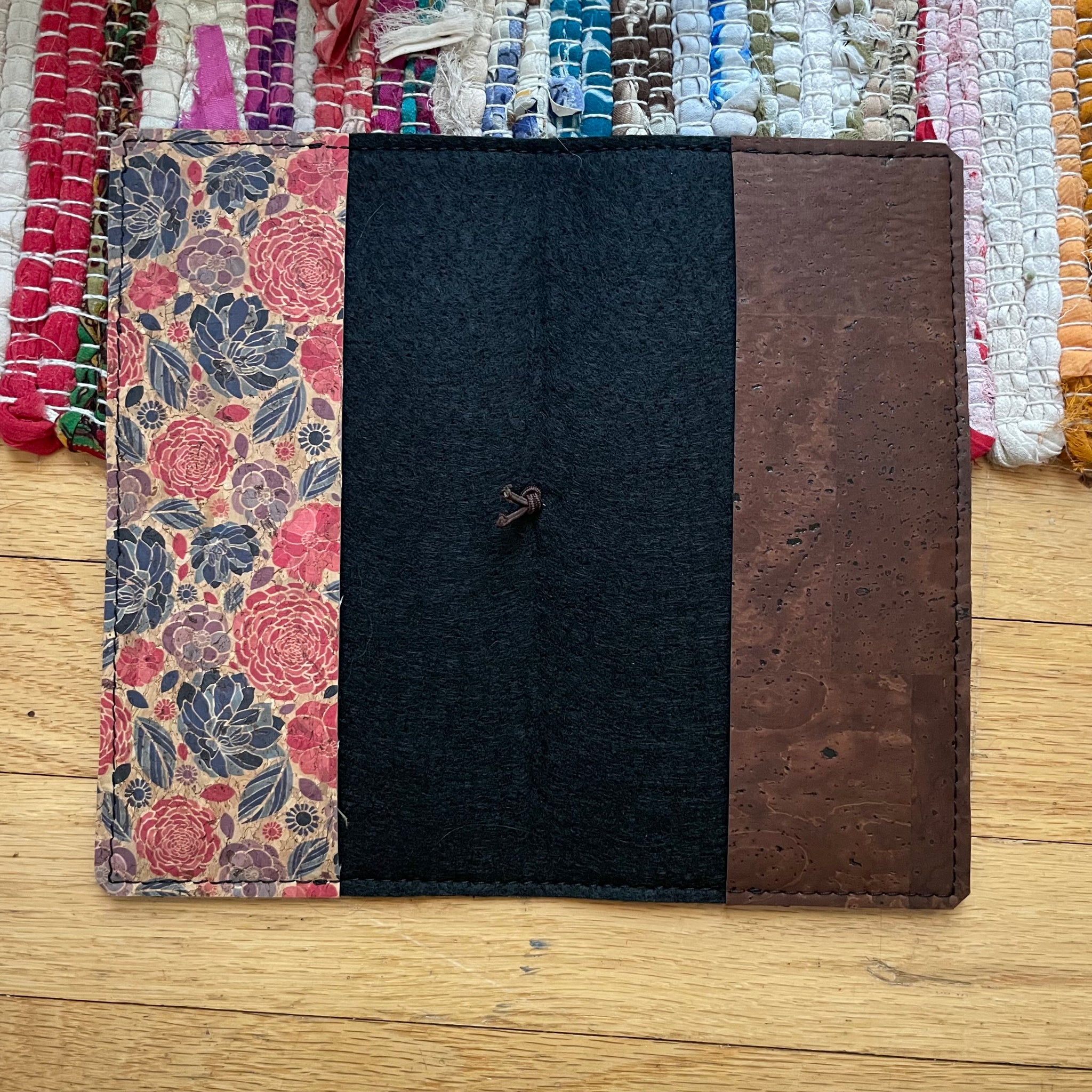 This is a Branch (deep brown) cork cover with a patterned jagged front pocket. It has black felt and one patterned and one brach inside pocket. This cover is finished with a brown elastic closure and brass accent. This cover is a folio style with inside pockets to slip your notebook inside.