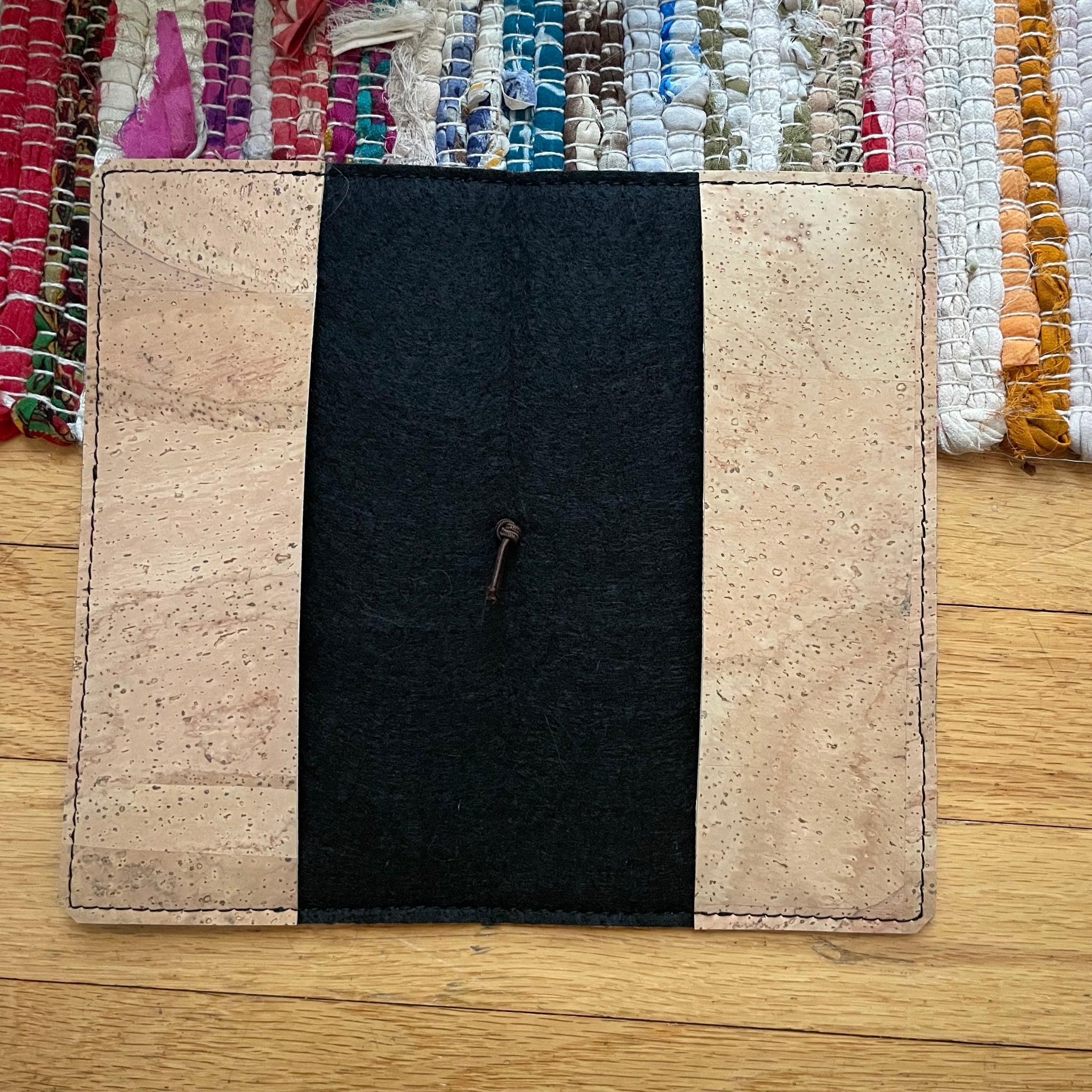 This is a Wheat (natural) cork cover with a patterned swoop front pocket. It has black felt and wheat inside pockets. This cover is finished with a brown elastic closure and brass accent. This cover is a folio style with inside pockets to slip your notebook inside.